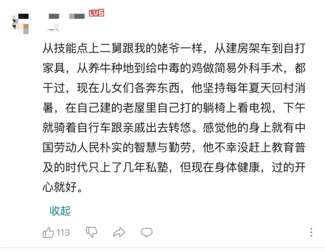 “二舅认真的活了半生,我分享了二舅的故事,大家听了还有点触动,这三者合起来就是个美好的小故事,美好的故事应该有一个美好的结尾,这些年大家看过的烂尾了的美好故事还少吗?让二舅安安静静的陪姥姥生活在那个小山村吧,那就是这个故事最美好的结尾。”
