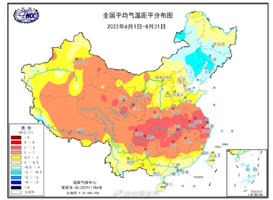 今年夏季(6月1日至8月31日)全国平均气温22.3℃,较常年同期偏高1.1℃,为1961年有完整气象观测记录以来历史同期最高。图片来源:微博@中国天气