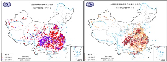 全国极端高温日分布。图片来源:微博@中国天气