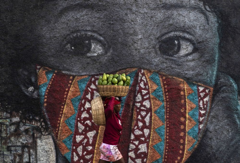 2021年8月24日,一名女子头顶水果走在海地太子港街头。戴维·德拉帕斯摄