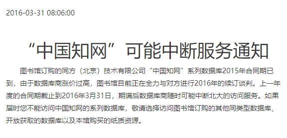 2016年3月31日,北京大学图书馆贴出的关于“中国知网可能中断服务”的通知
