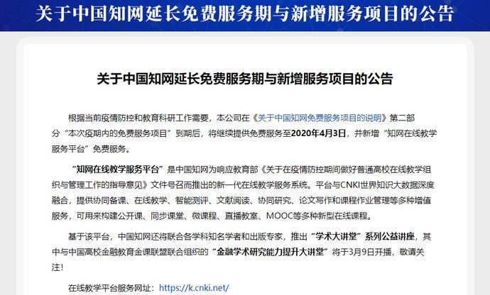 2020年3月2日,知网发布延长免费服务期与新增服务项目的公告,称将继续提供免费服务到2020年4月3日