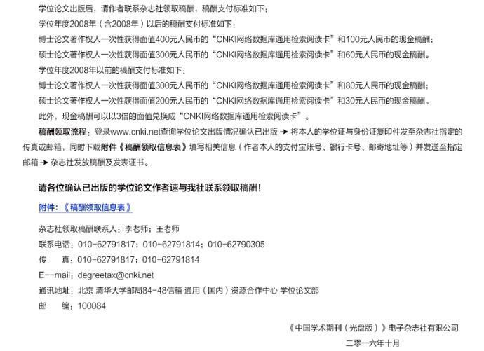 知网上关于学位论文稿酬的通告,而这份通告的发布时间是2016年10月