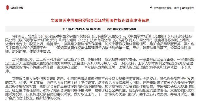 2017年,中国文字著作权协会起诉知网侵犯汪曾祺著作权。2019年6月26日,文著协官网发布公告称终审获胜
