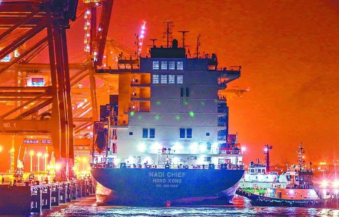 宁波舟山港金塘港区大浦口集装箱码头,集装箱轮正在进行货物装卸作业。大浦口集装箱码头拥有25条国际航线,往来25个“一带一路”沿线国家和地区的41个主要港口。
