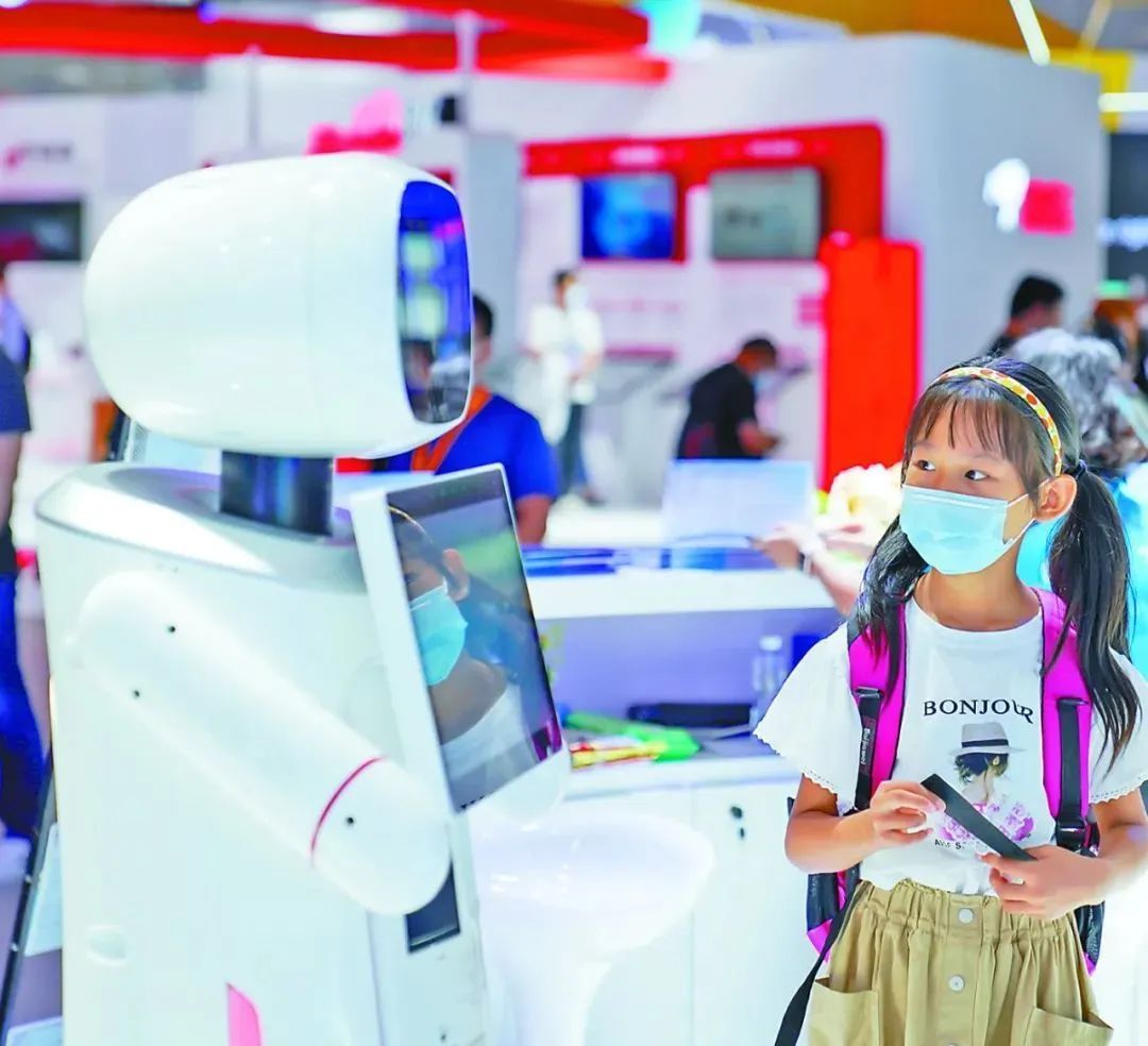 2021年中国国际服务贸易交易会综合展区,小朋友在和智能对话机器人互动。