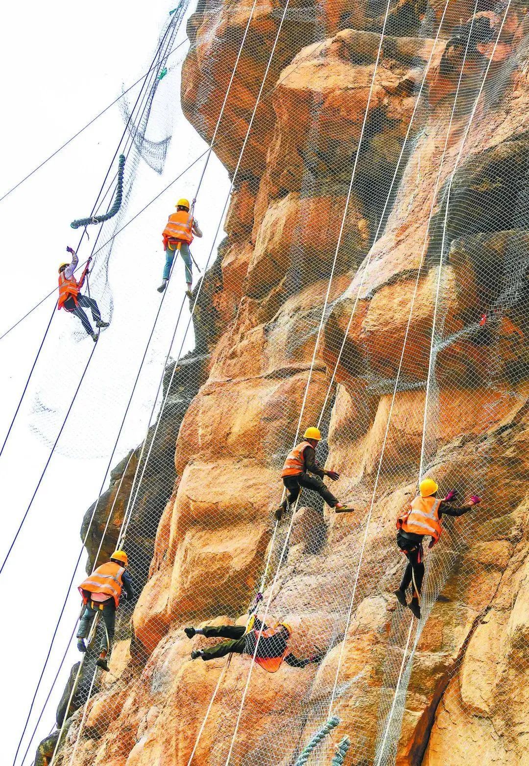 四川省凉山彝族自治州金阳县G4216高速公路施工现场,工人们在悬崖峭壁上安装柔性主动防护网,防止山上碎石掉落。