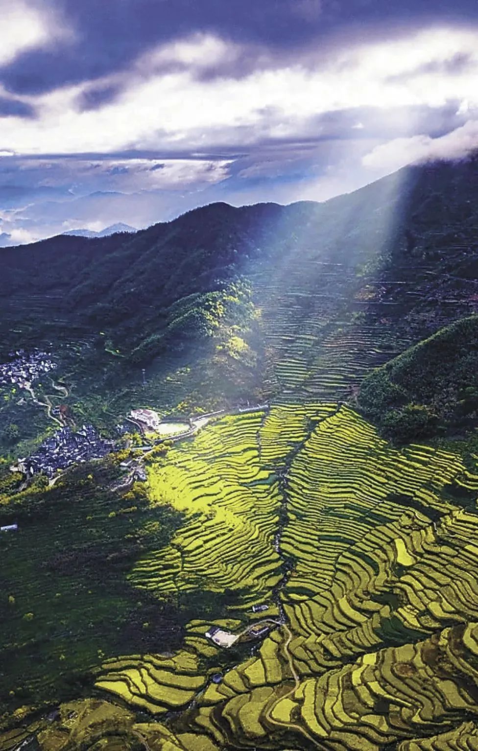 一缕阳光投射在东澄村千年梯田中的油菜花海。开垦并种植千年的千年梯田位于覆卮山的北坡,2.3万余块共计2300多亩的梯田由山腰倾泻而下,气势磅礴,绮丽壮观,成为东澄村重要的观光景点。