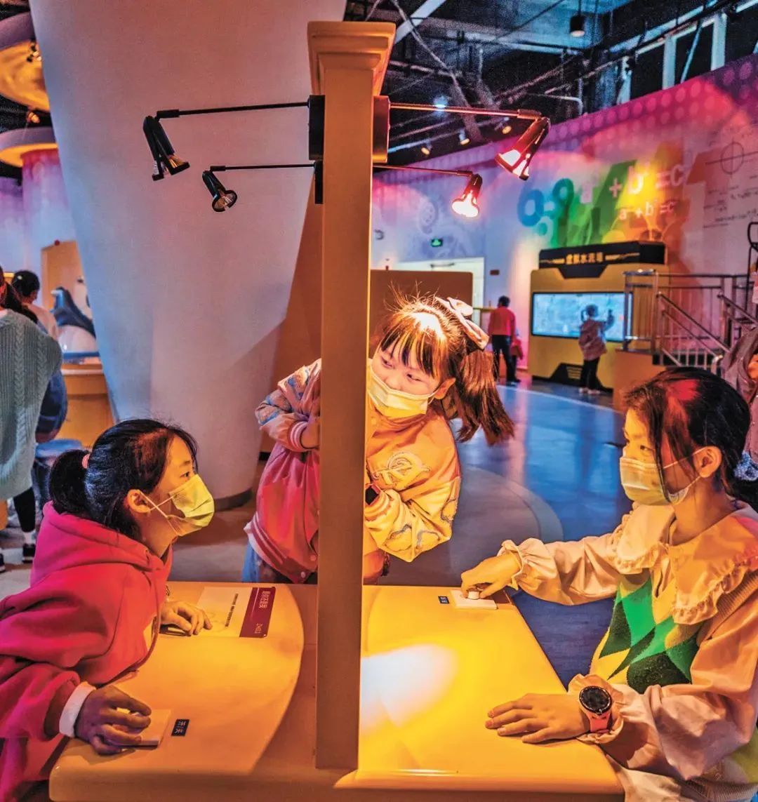 拍摄者巧妙地选取了拍摄角度,将科普装置上一面立着的隔板作为画面的分隔线;三个孩子在科普装置旁边交错环绕,拍摄者捕捉到她们专注的神态、可爱的表情,增强了画面的感染力;编辑在处理图片时,也注重将周边多余元素裁剪掉,突出三个孩子成为视觉中心,增强了画面的聚焦感。
