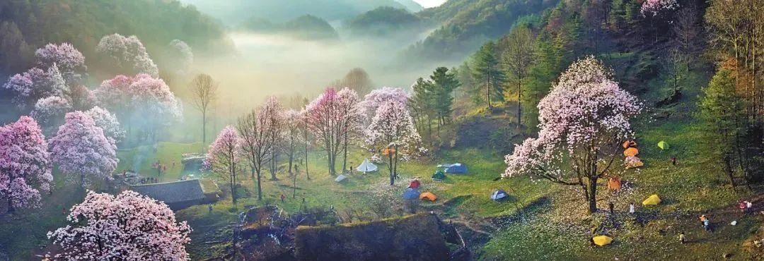 莽莽苍苍的群山间,只见河防口长城逶迤蜿蜒、气势雄浑,千亩杏花,烂漫绽放。画面以一处烽火台为视觉中心点,两段沿着山势起伏仿佛飘带一般的城墙自然延伸,成为画面的视觉导引线,杏花成团成簇、令人沉醉,很好地烘托了春山如笑的场景氛围。整个画面点线面结合,结构严谨,展现出一派春光明媚、春意盎然的景象。