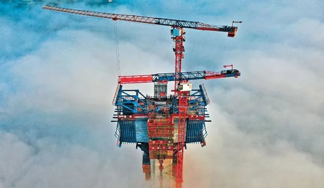 近日,在四川省泸州市龙马潭区,清晨的沱江笼罩在一片浓雾中。在一旁的渝昆高铁沱江特大桥40号主墩顶端,早起的工人们开始了一天的忙碌,从空中望去,宛若置身于云端上的工地。沱江特大桥是渝昆高铁重点控制性工程之一,全长2613米。