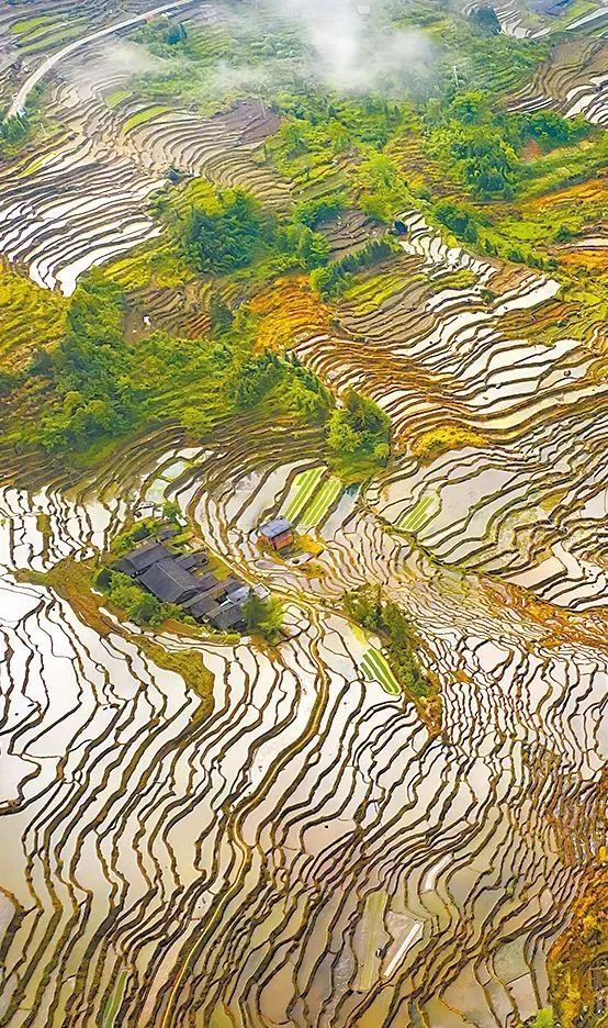 画面中,梯田从山腰上倾斜而下,在薄雾、绿树的映衬之下呈现出斑斓的色彩,像充满魅力的油画一般。拍摄者选取了空中俯拍的角度,定格了精彩的一角。编辑在上版时进行了适当的裁剪,使画面更聚焦于明亮如镜的梯田、错落有致的线条、点缀其间的绿意,共同勾勒出一幅乡村振兴的美丽画卷。