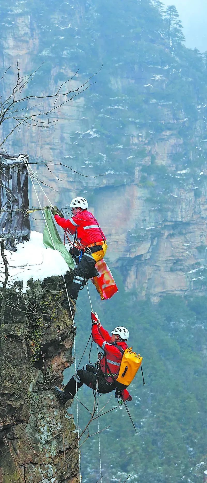 湖南省张家界市武陵源山地应急救援队队员在黄石寨的岩壁上索降,准备捡拾垃圾,以保护当地生态环境。
