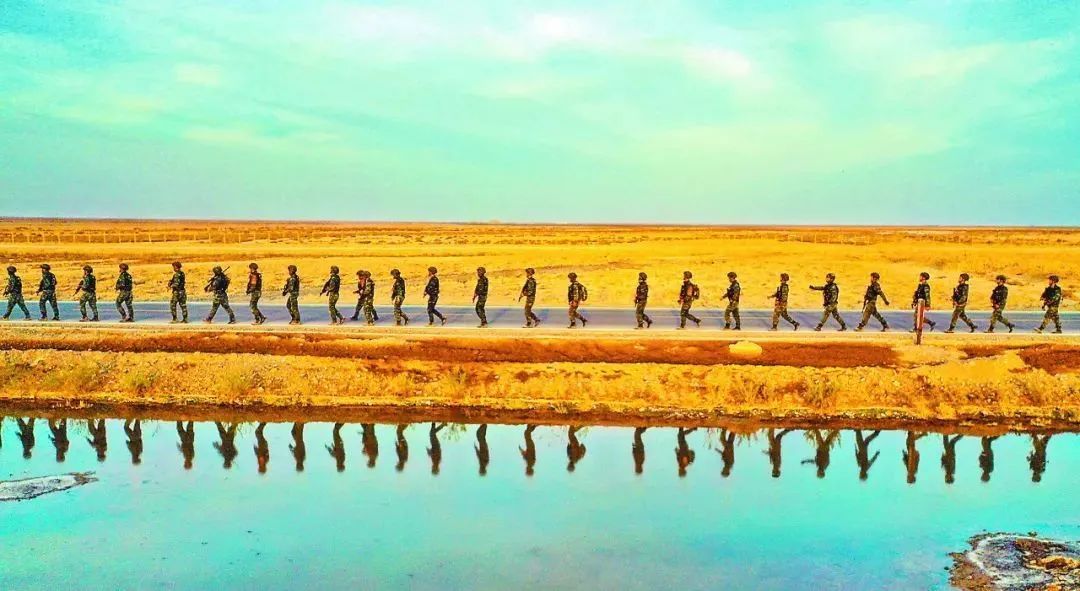 春光正好,练兵正忙。茫茫戈壁滩上,武警官兵整齐列队行进在湛蓝的艾丁湖畔。画面以湖岸为中心线,碧水映蓝天,战士们矫健的身影也正好倒映湖中,凸显了对称和谐之美。画面动静结合,色彩鲜明,虚实相生,在艰苦的戈壁荒漠背景衬托下,更加彰显了广大官兵高涨的训练热情和不畏艰辛的斗争精神,给人留下了震撼人心的视觉印象。
