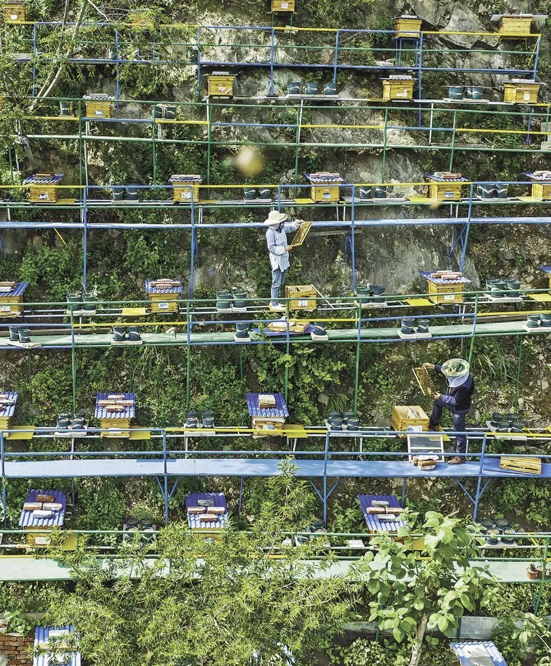 在笔直的悬崖壁上,蜂农将一个个蜂箱依次排列摆放,点点金黄夹杂在翠绿的山间,平铺式的画面布局、规则的线条感、独特的拍摄角度,构成了一幅美妙的画卷;两位蜂农点缀其中,为画面增添了视觉焦点和活力动感,也展现了劳动者艰苦奋斗的动人形象。编辑在处理图片时,进行了竖向裁剪,突出了画面的高度,拉长了视觉比例,使图片更有冲击力。