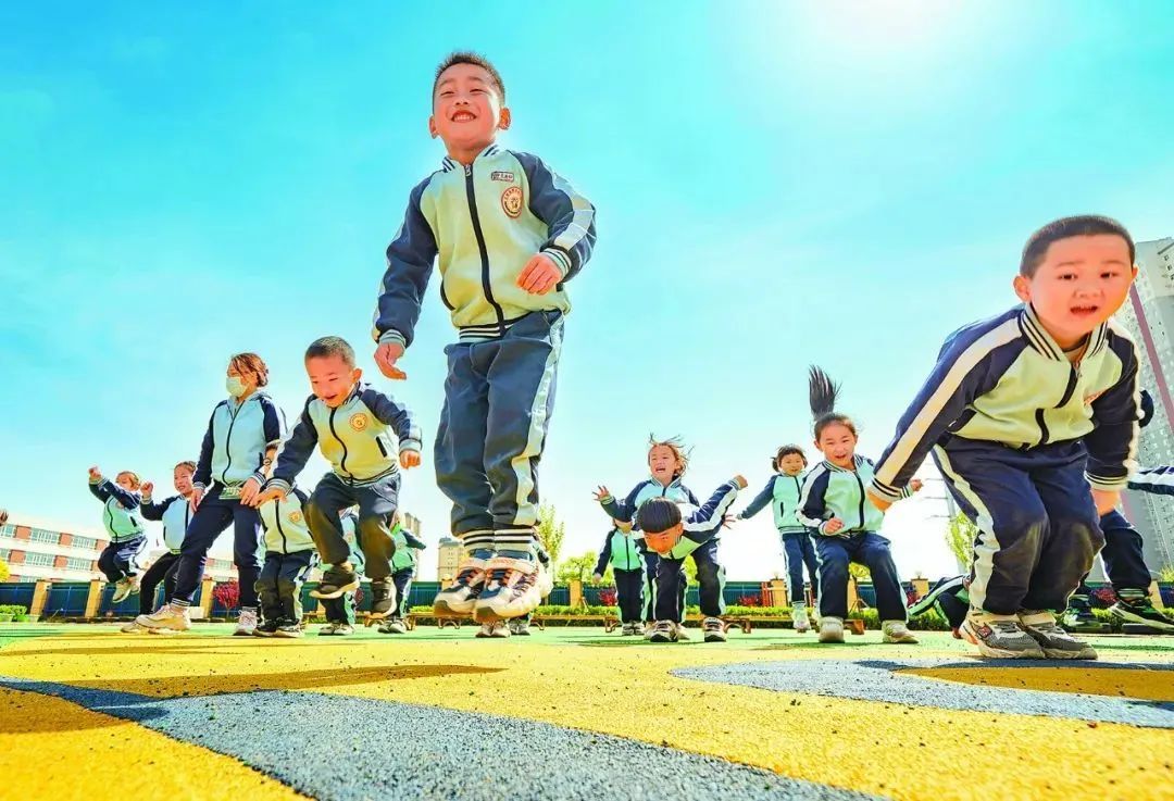 晴朗的天气,宽阔的操场,画面定格了河北省石家庄市一幼儿园老师和孩子们愉快游戏的场景。图片采用仰拍角度,突出了孩子们跳跃一刻的动感,并捕捉到每个孩子脸上的神情,幸福快乐的情绪跃然图上,生动展现了一幅健康童年之景。