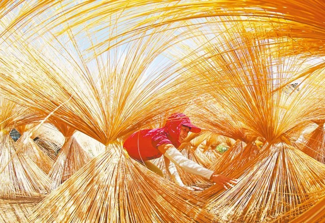 捆扎整齐的竹条正在晴空下晾晒,金黄色的线条铺满画面,烘托出浓浓的收获氛围。在满眼金黄间,女工的红衣红帽格外显眼,为画面增添了亮色与活力。女工的脸上笑容满溢,这是劳动后丰收的喜悦,也是对美好生活的期待和满足。