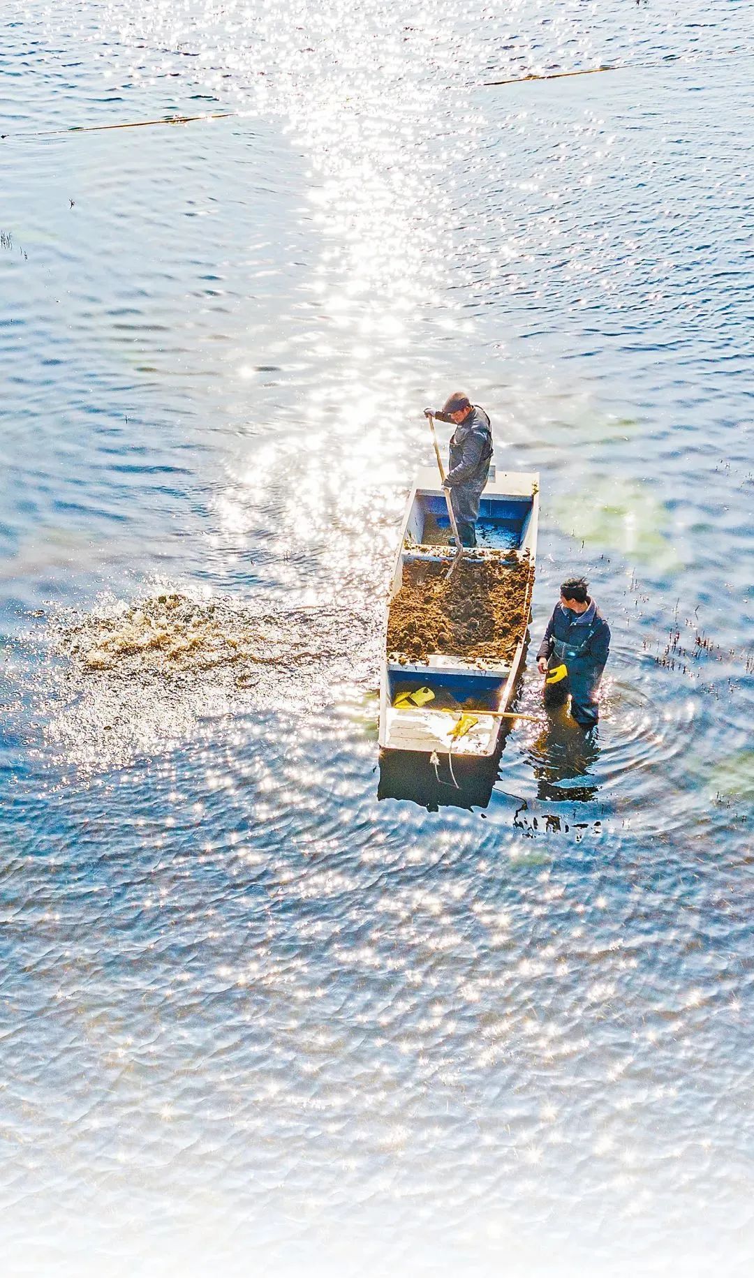 安徽芜湖市繁昌区孙村镇义兴村,农民正在给小龙虾投放饲料。