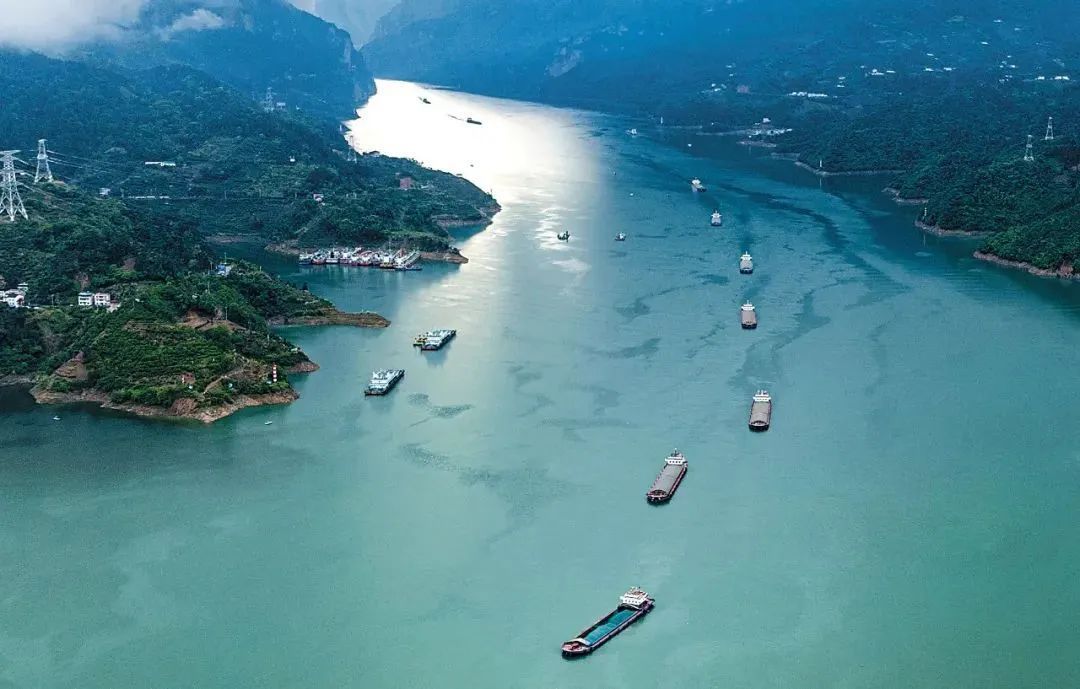 雨后三峡,水面波光粼粼,周边云雾缭绕。三角形的画面构图,使得往来船舶由远及近,次第呈现眼前,形成线性美感;色彩上,墨绿、深绿、浅绿层层叠叠,浓淡相宜,搭配远处的光影,犹如一卷青绿山水图徐徐展开,十分赏心悦目。