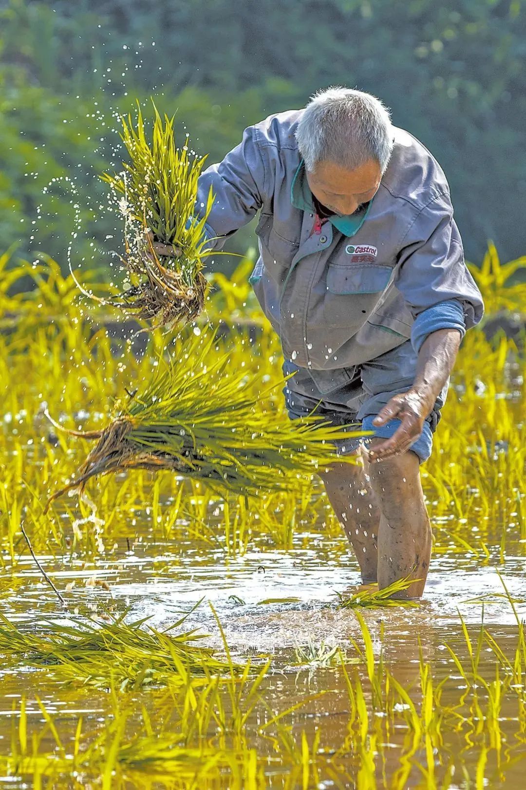 日头正盛,劳作的农民、泥泞的水田、抛起的秧苗、飞溅的水珠,直观说明了田间劳作的忙碌热切。更仔细地观察,劳作者头发花白、手脚青筋分明,虽然上了年纪,却依然专注有力。正是无数这样的农民,为了美好生活勤勉劳作、挥洒汗水,确保粮食生产。真实引发共鸣,细节打动人心,这张图片做出了很好的诠释。