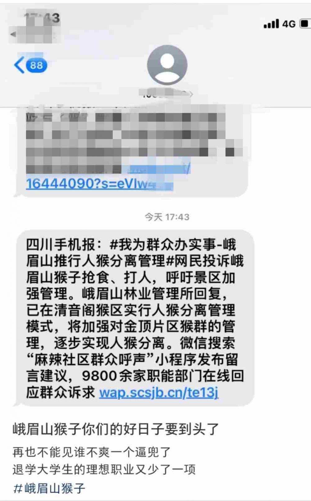 近日,一条名为“峨眉山的猴子你们的好日子到头了”的网帖引发网友关注。该网帖附上了一张截图。截图中称,峨眉山将推行“人猴分离”管理。截图内容是:网友投诉峨眉山猴子抢食、打人,呼吁景区加强管理。峨眉山林业管理所回复,已在清音阁猴区实行“人猴分离”管理模式,将加强对金顶片区猴群的管理,逐步实现“人猴分离”。网帖后的评论称“管理员跟猴子的较量开始了”,还有网友说“黔灵山的猴子也潇洒不了多久了”。