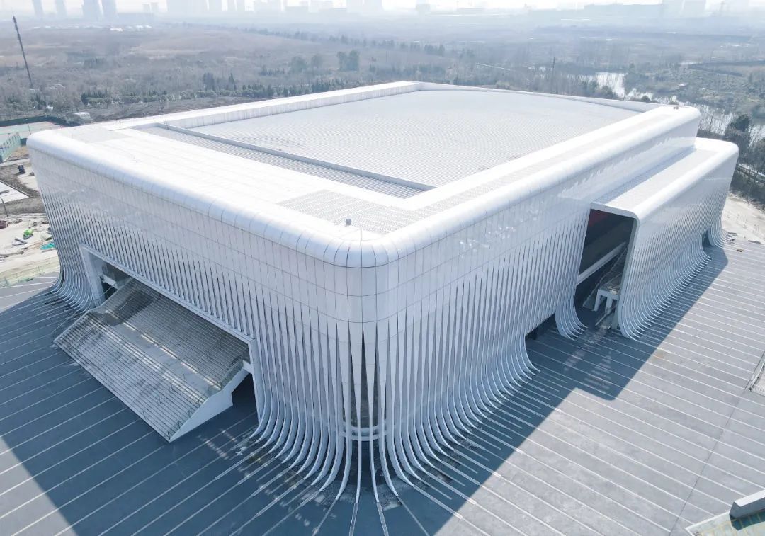 场馆屋顶采用先进的张弦梁结构,营造清爽整洁的室内视觉效果,外部笼罩着308缕“水幔”,形似百叶窗,是天然的遮阳层,减少室内炫光。“水幔”从顶部缓缓垂落并延伸至地面绿化处,在靠近地面处都配有灯光,亮灯后,能投屏呈现出特定图案,美轮美奂。