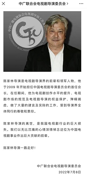 中广联合会电视剧导演委员会7月9日发布讣告:中广联合会电视剧导演委员会原会长、长春电影制片厂国家一级导演陈家林同志,因长期患病医治无效,于2022年7月7日在北京不幸逝世,享年79岁。
