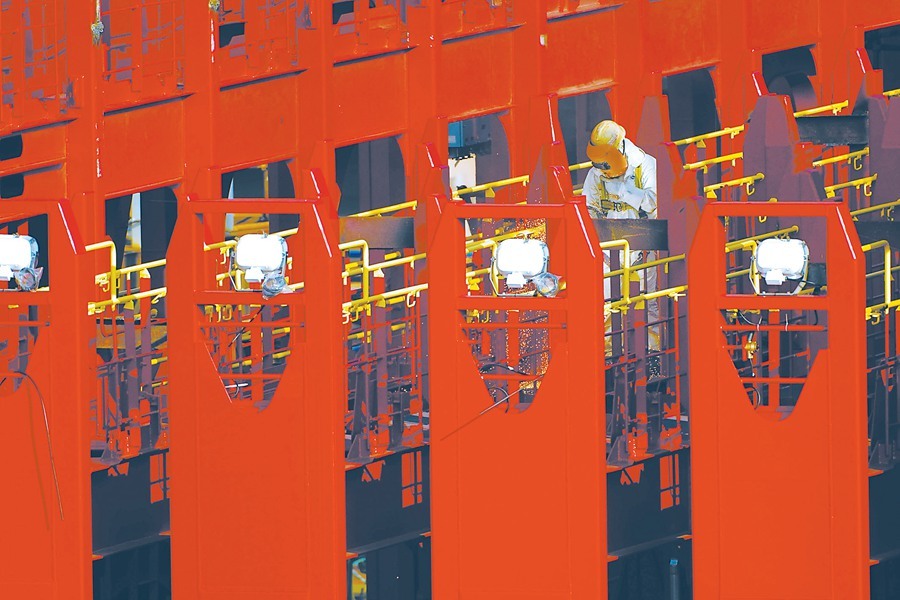 施工人员正在焊接“长益”号的绑扎桥。 张黎 摄