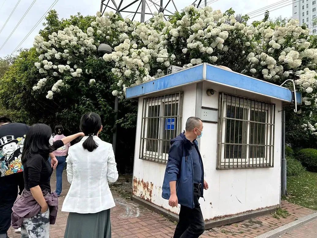 13日中午12时许,澎湃新闻记者在漕河泾地铁站1号口、宜山路沿线看到,“岗亭拍照点”正在拆卸。岗亭的上方和后方,白色的木绣球花正在热烈盛放。