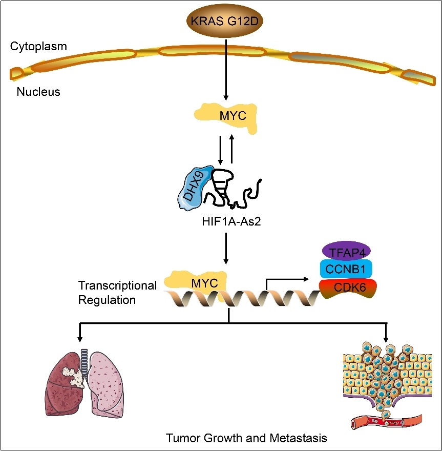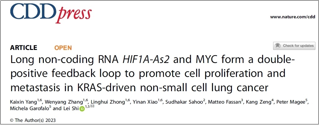 近日,兰州大学公共卫生学院石磊教授团队发现了KRAS G12D通过诱导长链非编码RNA HIF1A-As2调控肺癌发展新机制,以”Long non-coding RNA HIF1A-As2 and MYC form a double-positive feedback loop to promote cell proliferation and metastasis in KRAS-driven non-small cell lung cancer”为题在线发表研究论文于期刊Cell Death & Differentiation。研究生杨凯鑫、张文杨、钟灵慧和肖意楠为共同第一作者,石磊为通讯作者。论文揭示了lncRNA HIF1A-As2与MYC形成双向调控环路,促进KRAS G12D诱导的非小细胞肺癌发生发展和转移。