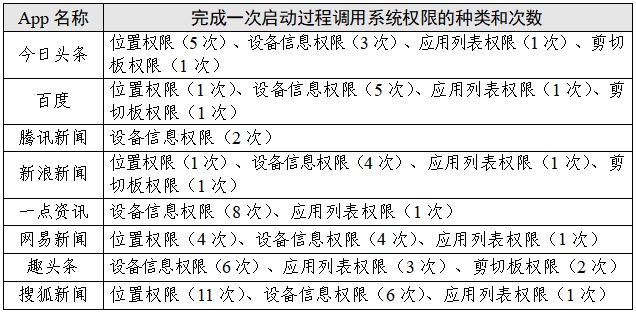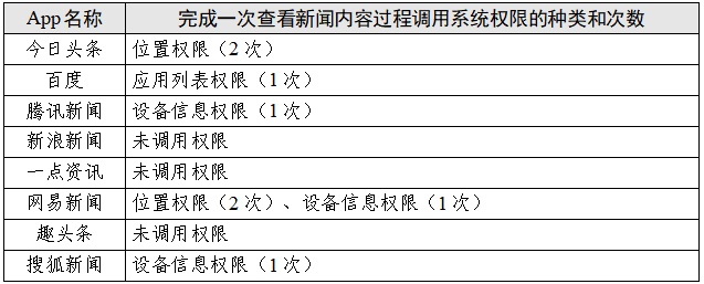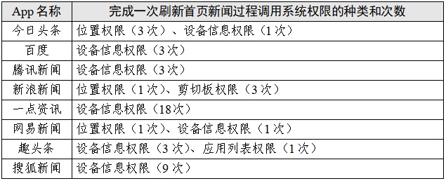 (2)在刷新首页新闻场景中,调用系统权限种类最多的为今日头条、新浪新闻、网易新闻、趣头条(均为2类),调用系统权限次数最多的为一点资讯(18次)。具体情况如表3。