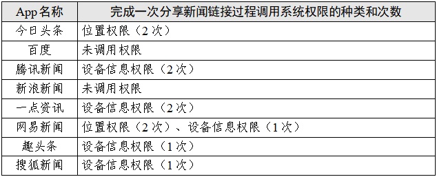 (4)在分享新闻链接场景中,调用系统权限种类和次数最多的均为网易新闻(2类、3次)。具体情况如表5。