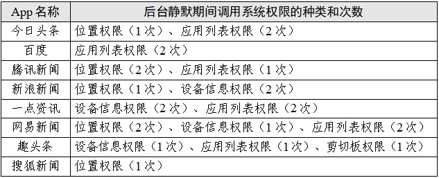 (5)在后台静默场景中,调用系统权限种类最多的为网易新闻和趣头条(均为3类),调用系统权限次数最多的为网易新闻(5次)。具体情况如表6。