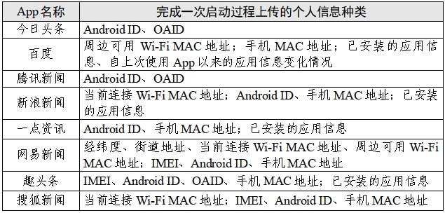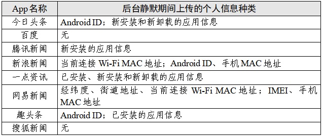 (5)在后台静默场景中,个人信息上传种类最多的为今日头条、新浪新闻、网易新闻、趣头条(均为2类)。具体情况如表11。