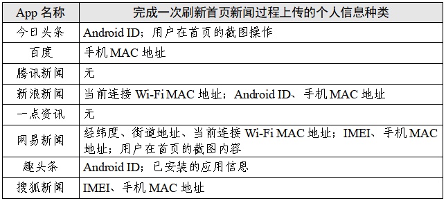 (2)在刷新首页新闻场景中,个人信息上传种类最多的为网易新闻(3类)。具体情况如表8。