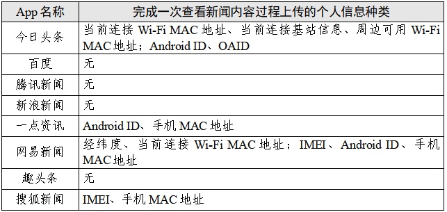 (3)在查看新闻内容场景中,个人信息上传种类最多的为今日头条和网易新闻(均为2类)。具体情况如表9。