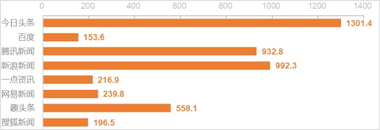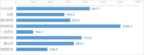 (1)8款App在用户完成一次新闻资讯浏览活动(启动App、刷新首页新闻、查看新闻内容、分享新闻链接)时,上传数据流量平均⁽³⁾最多的为新浪新闻,约为1200KB;平均最少的为一点资讯,约为195KB。具体情况如图1。