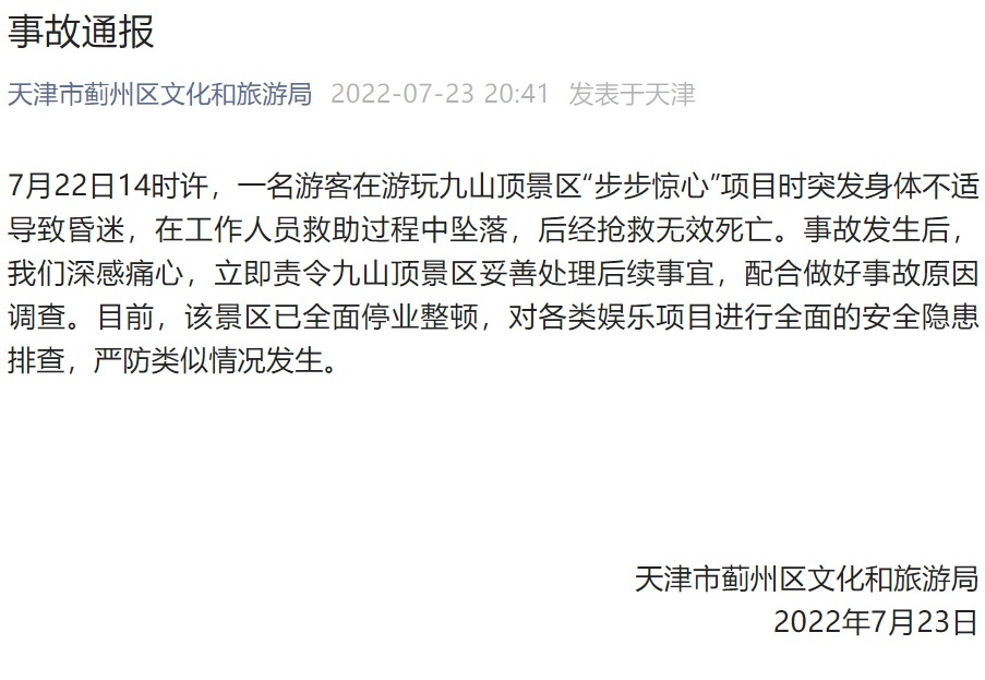 7月22日,一名游客在天津九山顶景区游玩“步步惊心”项目时,突发身体不适导致昏迷,在工作人员救助过程中坠落,后经抢救无效死亡。目前,该景区已全面停业整顿。