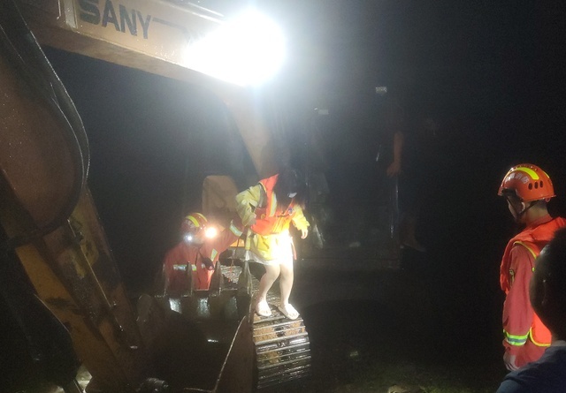 近日,湖南省长沙市的9名游客在浏阳市沿溪镇大光洞景区露营时被洪水围困,救援人员调来一辆大型挖掘机化解险情。