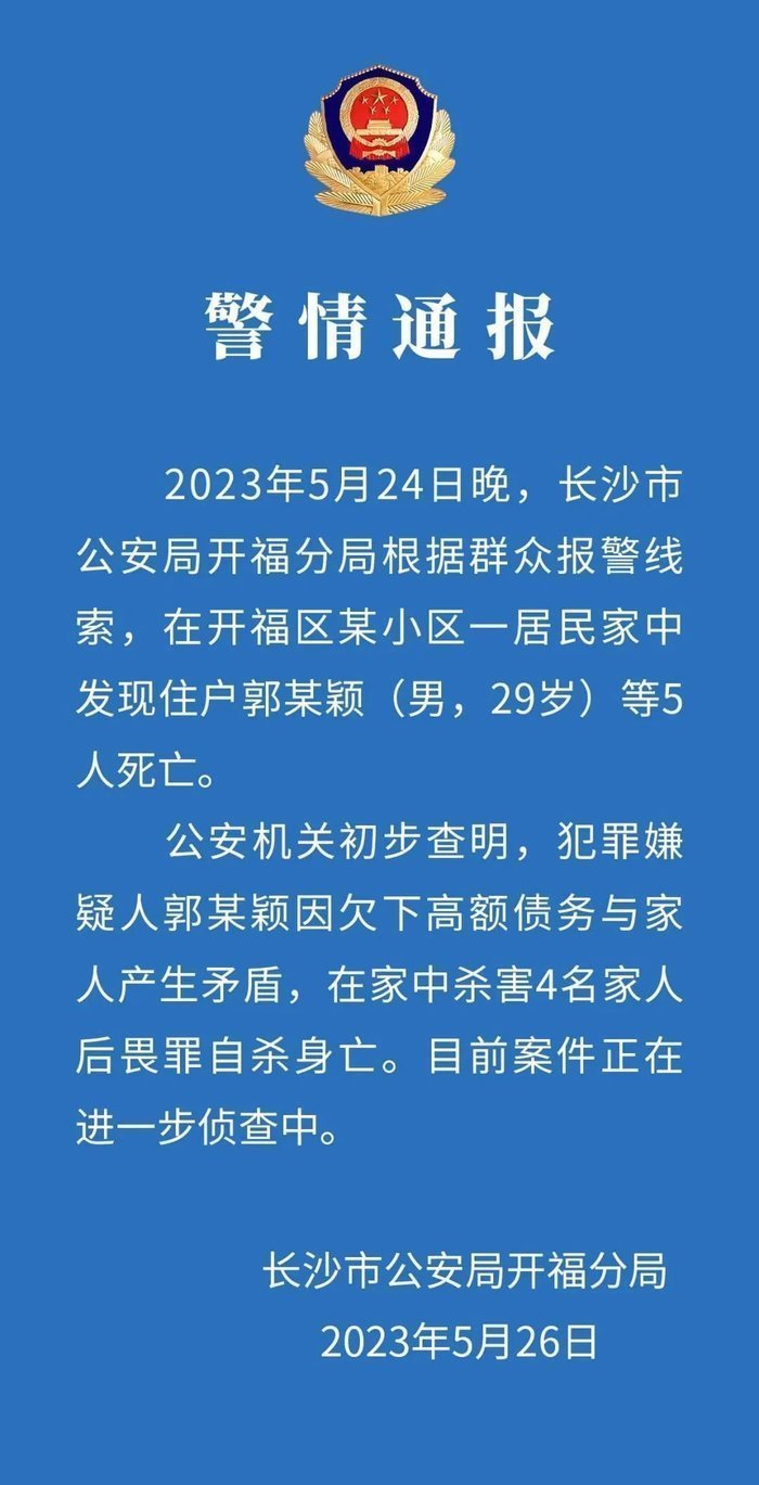 5月26日,长沙市公安局开福分局就某小区一居民家中5人死亡案发布警情通报。通报全文如下: