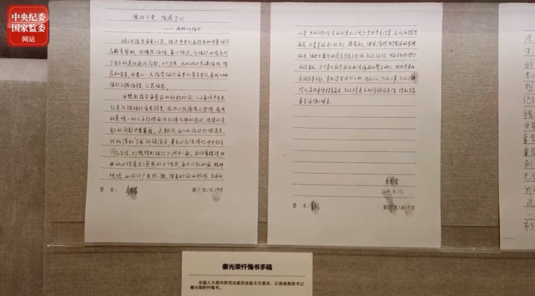 在忏悔书中,秦光荣在第一段写道,“4月6日接受审查以来,经过中央纪委领导和专案组同志教育帮助,我幡然悔悟,真心悔过,向组织如实交代了自己的违纪违法问题。4个月来,我的内心充满悔恨、愧疚和自责,我要以一名接受组织审查的党员身份,真诚地向组织认错悔错、认罪悔罪。”