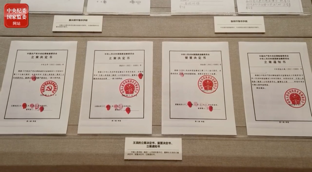 此次展览还公布了中国人寿保险(集团)公司原党委书记、董事长王滨的立案决定书、留置决定书和立案通知书。