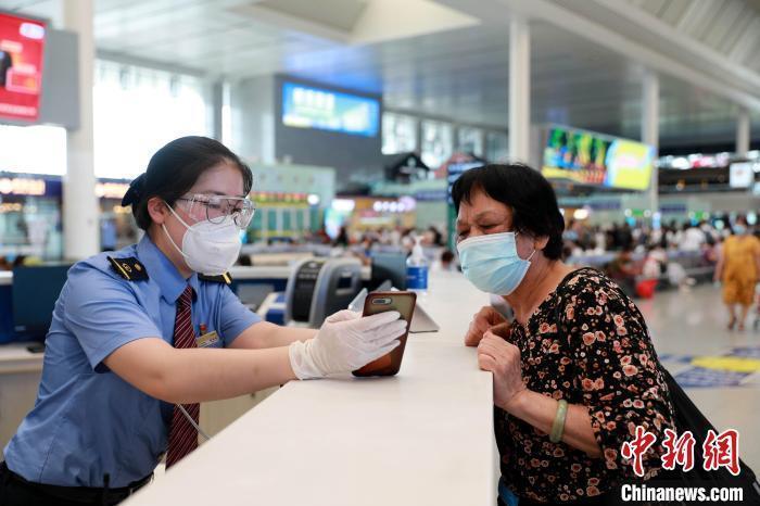 资料图:南宁东站工作人员帮助老年旅客查看购票信息。于莉 摄