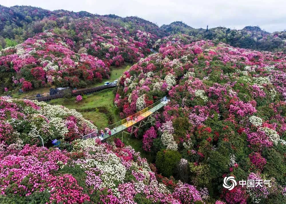 目前贵州、湖北、重庆等地的杜鹃花已经进入最佳观赏期。在北方,著名的杜鹃花观赏地青岛大珠山上,最早开花的杜鹃品种蓝荆子,也在3月底迎来了初花期,预计4月3日进入到盛花期,今年大珠山蓝荆子的开放时间较去年晚了一周,正好与清明假期撞了个满怀。