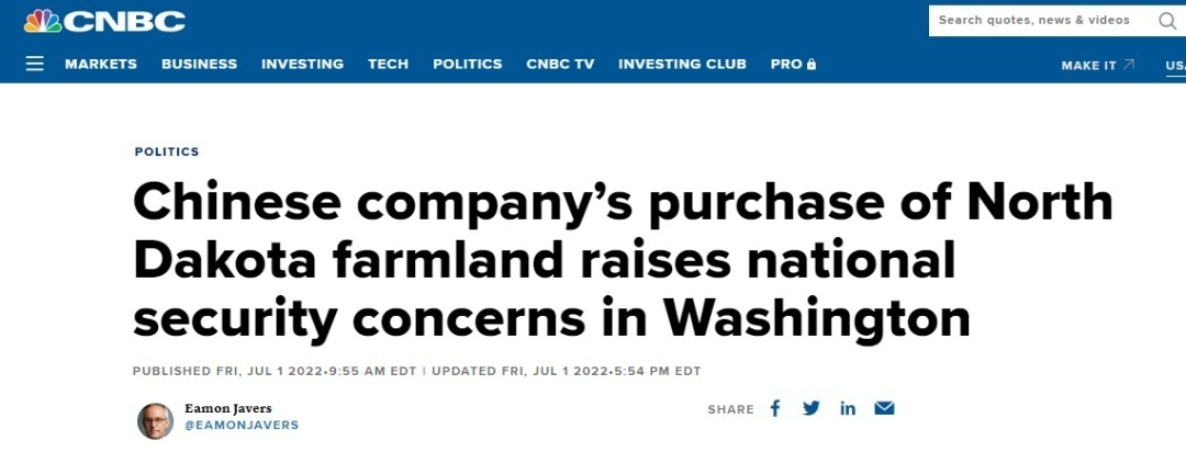 据美国消费者新闻与商业频道(CNBC)7月1日报道,今年春季,中国企业阜丰集团购买了这块位于美国北达科他州的农地,计划建设一座玉米加工厂。