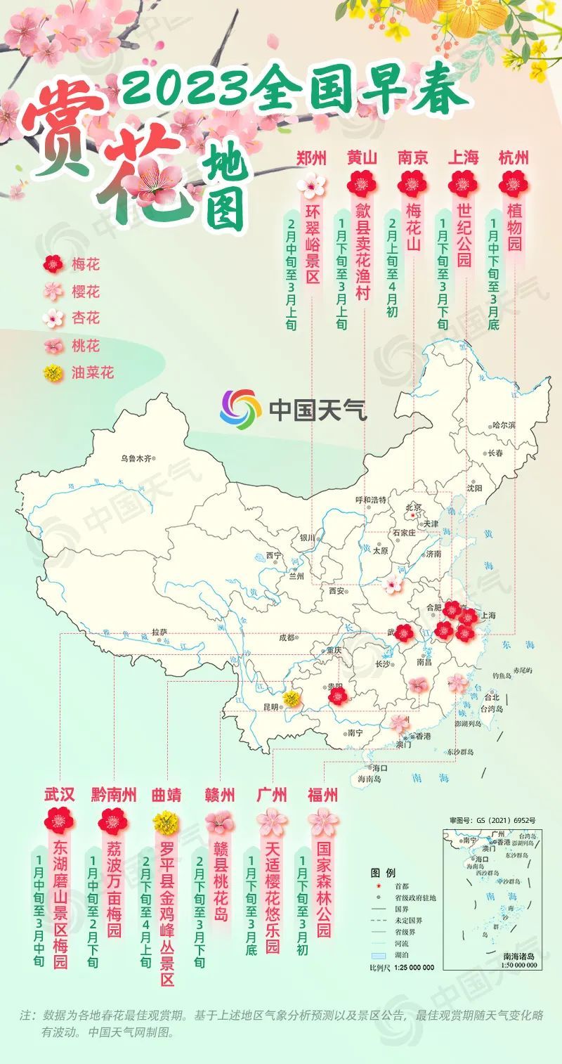 “春风先发苑中梅,樱杏桃梨次第开。”即将进入雨水节气,常年此时,我国春季前沿抵达福建北部、江西南部、广西北部、贵州南部以及重庆一带,眼下,不少地方梅花、樱花、油菜花等陆续进入佳观赏期。中国天气网特别推出早春赏花地图,带你一探这初春美好景色。