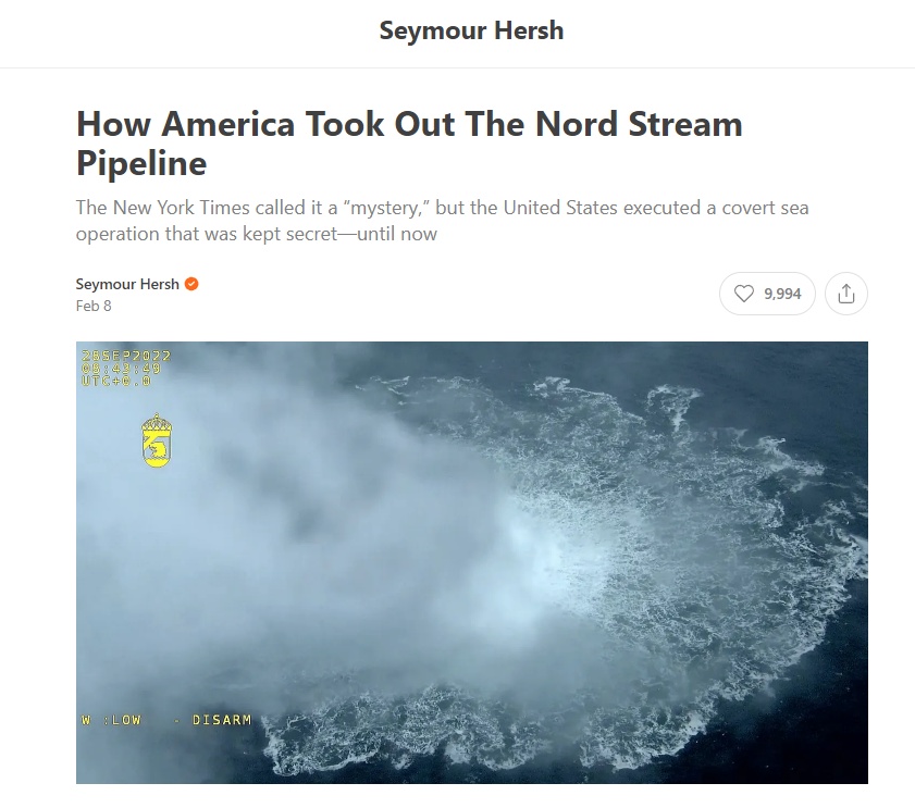 今年2月,美国独立调查记者西摩·赫什(Seymour Hersh)在其个人网站发布一篇调查报道,评述北溪管道被炸事件的来龙去脉,将矛头直指美国,引发全球舆论哗然。