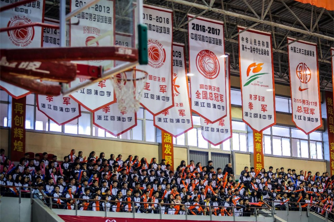 在回浦中学的篮球馆内,左右两侧上空各悬挂着两排巨型锦旗,一侧是历年获得的全国前三,另一侧全是浙江省冠军。