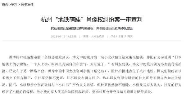 此前,杭州地铁上一小女孩照片被网友盗图,并配“日本地铁小乘客”字样发布,在小女孩家属发布辟谣后仍拒不删除,后经法院审理,认为盗图网友侵犯肖像权,责令其赔礼道歉。