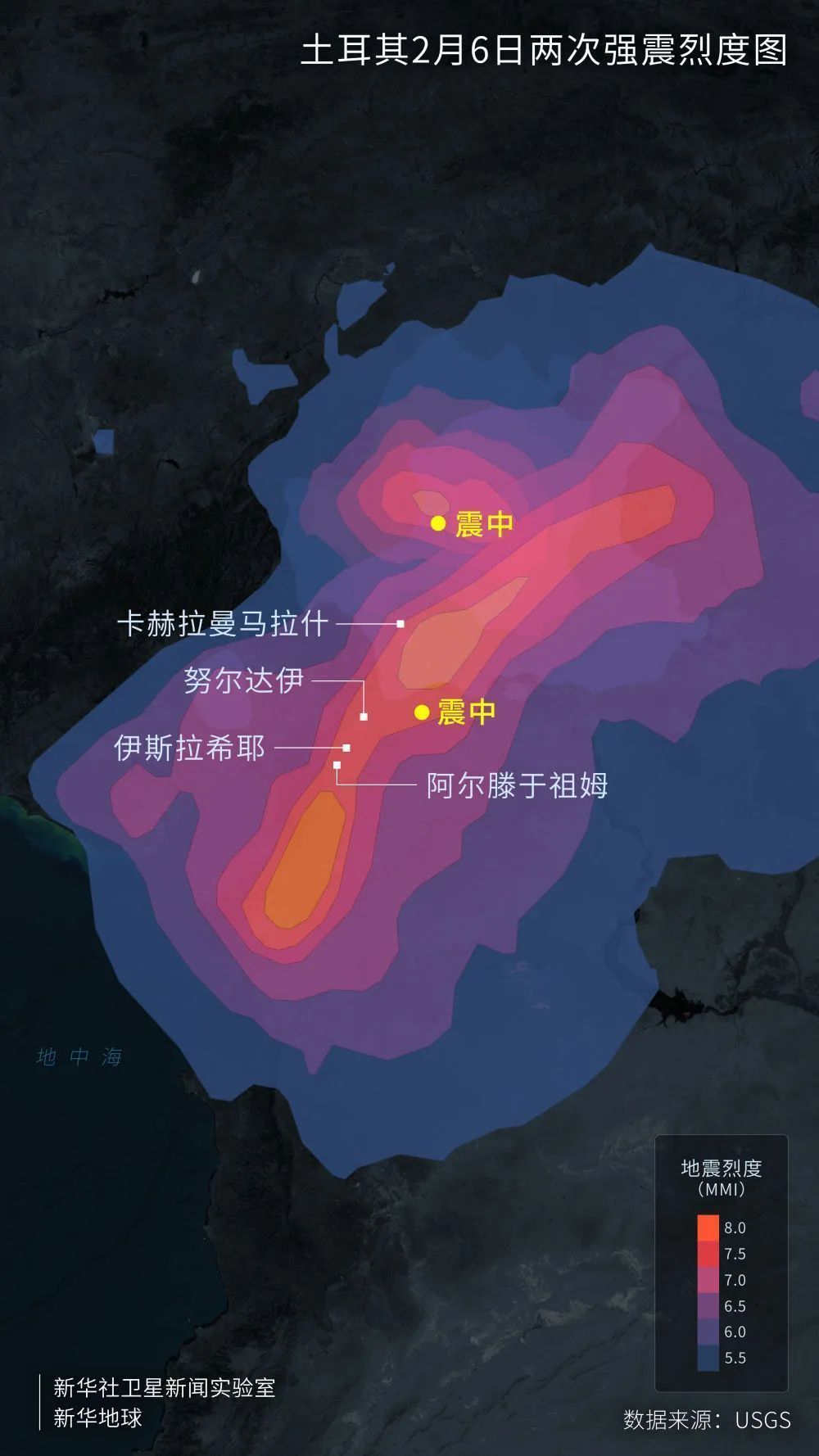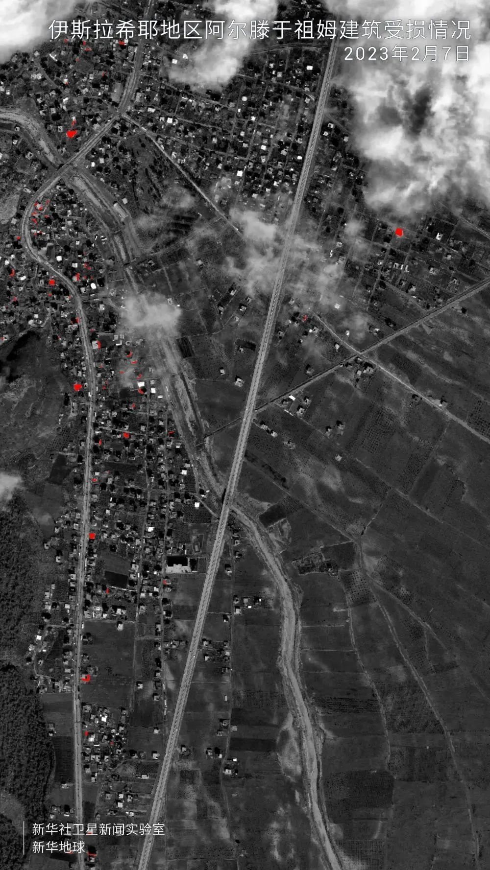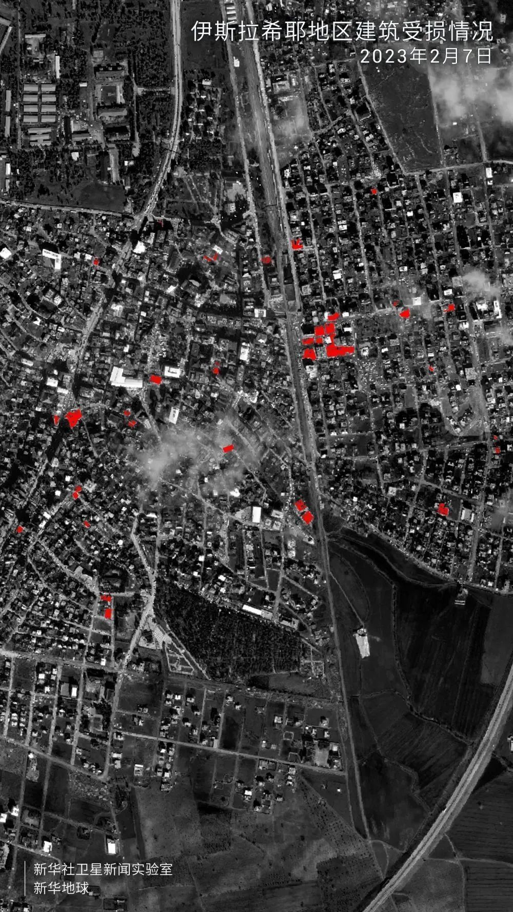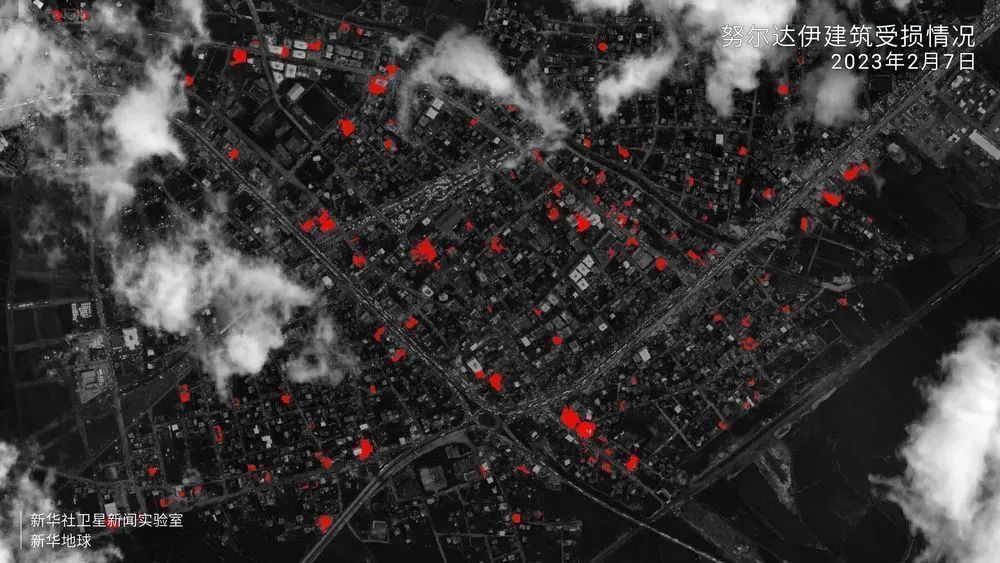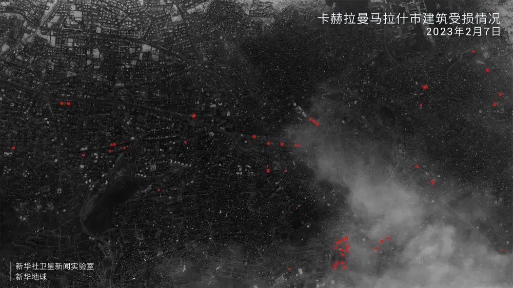 利用“新华地球”系统内置的人工智能模块,识别并分析2月7日卫星遥感数据,震中附近地区受损建筑数量和面积直观呈现。考虑遥感影像覆盖范围局限、部分区域有云层遮挡等因素,结果显示,距离第一次强震震中60公里以内的努尔达伊、伊斯拉希耶、卡赫拉曼马拉什等区域,可检测到的受灾建筑有300余处,损毁及坍塌覆盖面积13余万平方米。因距震中远近不同、地质结构存在差异,各地损毁情况不一。